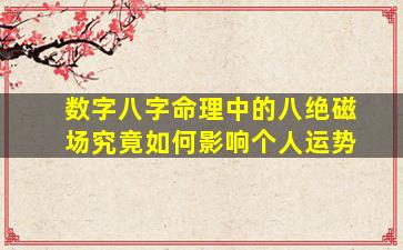 “数字八字命理”是近年来在民间流传的一种命理学说,结合了传统八字命理和数字能量学的概念。其中“八绝磁场”被认为是影响个人运势的关键因素之一。以下从传统命理和数字能量学的角度,结合现代视角,对其影响进行客观分析: