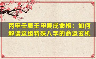 这组“丙申 壬辰 壬申 庚戌”八字呈现了鲜明的五行生克与十神组合,其命运玄机可从以下几个维度解析: