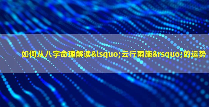 在八字命理学中,“云行雨施”出自《周易·乾卦》,象征天道的运行与恩泽广布。从命理角度解读,这一概念多与五行流通、气机生发相关,尤其体现为水火既济、木火通明或水土相调等格局。以下从多个维度解析其运势特征: