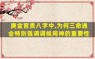 在八字命理学中,庚金作为阳金,象征刚健、锐利、坚韧的金属特质,尤其代表刀剑、矿石等物。而“官贵”格局通常指八字中官星(正官或七杀)得用,主贵气、事业、名声。《三命通会》作为经典命理典籍,特别强调调候用神对庚金官贵八字的重要性,原因可从以下几个方面理解: