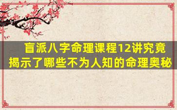关于“盲派八字命理课程12讲”可能揭示的命理奥秘,目前网络上存在多种版本的相关课程,内容差异较大,但综合盲派传统和常见命理教学方向,可以出以下可能涉及的核心理念和独特方法: