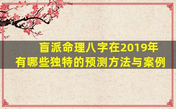 关于盲派命理在2019年的独特预测方法与案例,由于盲派命理本身以口传心授、注重实战为特点,且公开的学术资料较少,其具体年度预测方法和案例通常不会系统性地公开发表。不过,结合盲派的理论特点和2019年的干支流年(己亥年),可以一些可能的应用方向和推测性案例: