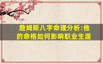 从传统八字命理的角度分析一个人的命运与职业发展,需结合其出生年月日时(八字)及五行生克、十神配置等要素。由于詹姆斯(LeBron James)的准确出生时辰未公开,以下仅基于其公开的生日(1984年12月30日,美国俄亥俄州阿克伦)进行粗略推算,供参考:
