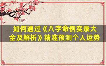 《八字命例实录大全及解析》这类书籍通常通过系统化的命例分析和理论,帮助读者学习八字命理预测的技巧。要精准预测个人运势,需结合以下步骤和方法:
