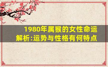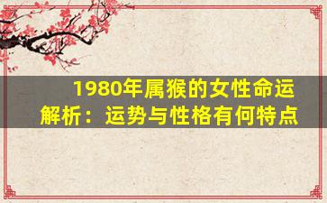 在中国传统命理学中,生肖与出生年份的结合常被用来分析一个人的性格特征和运势走向。1980年(庚申年)出生的属猴女性,其命运解析可从五行、生肖特性及流年运势等多角度综合探讨。以下为具体分析: