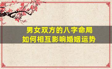 在中国传统命理学中,八字(四柱)被认为能揭示个人的性格、运势及婚姻走向。男女双方的八字命局相互影响婚姻运势,主要通过以下几个方面: