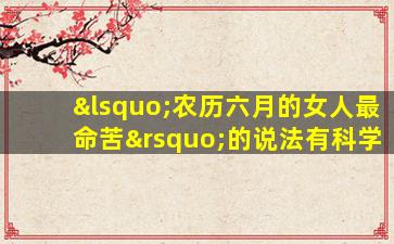 关于“农历六月的女人最命苦”的说法,目前没有科学依据支持这种观点。这一说法属于民间俗信或迷信范畴,与科学研究的结论无关。我们可以从以下几个角度分析: