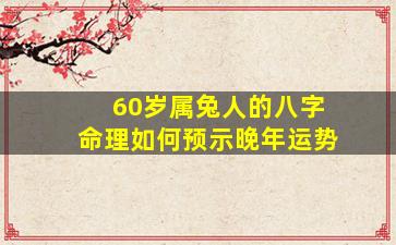 在八字命理中,60岁属兔人(虚岁)的晚年运势需结合其生辰八字(年、月、日、时四柱)综合分析,但属兔人本身对应的地支为“卯”,可结合2023年(癸卯年)流年运势及普遍规律,从五行生克、十神配置等角度推测晚年趋势。以下是常见分析框架: