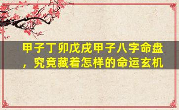 您的八字为:甲子 丁卯 戊戌 甲子。以下从五行、十神、格局等角度为您解析命盘玄机: