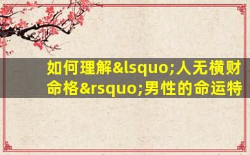 “人无横财命格”是命理学中的一种说法,通常指一个人的八字、五行配置或运势中缺乏突发性、意外之财(如投资暴利、彩票中奖等)的象征,更多依赖稳定、渐进的收入方式。对于男性而言,这种命格特征可能体现在性格、职业选择和人生轨迹上,以下从传统命理和现实角度综合分析: