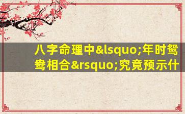 在八字命理中,“年时鸳鸯相合”是一种特殊的干支组合形式,通常指命主的年柱与时柱的天干或地支相合(如天干五合、地支六合等)。这种结构被称为“鸳鸯合”,因其象征首尾呼应、和谐联结的特点,常被赋予特殊的命理寓意。以下是其可能的预示和解读方向: