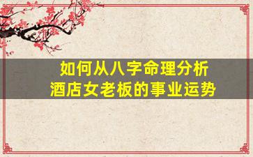 从八字命理分析酒店女老板的事业运势,需结合命局中的财星、官杀、印星、食伤等十神关系,以及五行生克、大运流年等因素综合判断。以下是具体分析步骤和要点: