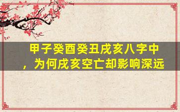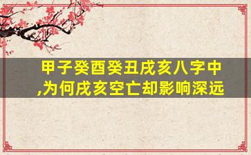 在八字命理中,空亡(又称“旬空”)是一个重要的概念,指地支因天干循环配对时出现的空缺状态。关于你提到的“甲子癸酉癸丑戌亥”中戌亥空亡的影响深远问题,需从以下几个角度分析: