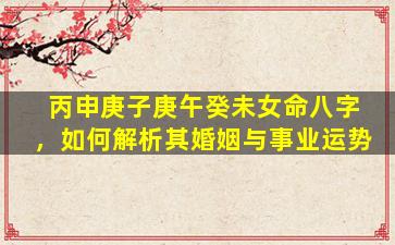 根据您提供的八字 丙申 庚子 庚午 癸未(女命),现从婚姻与事业两方面进行解析,结合五行生克、十神配置及大运走势综合分析: