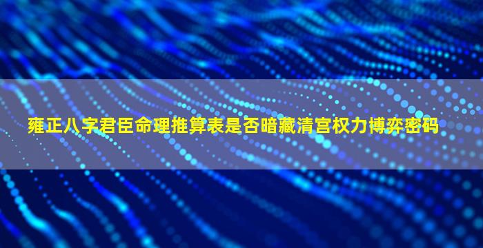 关于雍正皇帝的八字命理与清宫权力博弈的关系,这一问题涉及历史学、命理学和政治权谋的多重解读,需谨慎对待。以下是综合分析: