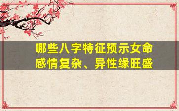 在八字命理中,女命的感情复杂、异性缘旺盛通常与命局中的十神组合、五行生克及神煞等因素相关。以下是一些常见的八字特征: