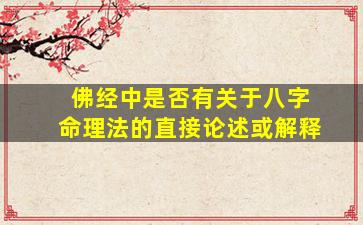 在传统佛经中,并没有关于“八字命理法”(即中国民间流行的生辰八字算命术)的直接论述或系统解释。佛教经典的核心教义聚焦于四圣谛、缘起法、因果业力、解脱之道等内容,而八字命理属于中国传统文化中的命理学体系,两者在理论框架和目的上存在本质差异。以下从几个方面具体分析: