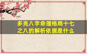 关于“多亮八字命理格局十七之八”的解析依据,目前公开的命理学资料中并未有明确记载这一特定分类体系(如“十七之八”)的权威来源。这一表述可能源自以下两种情况,需结合命理学的常规分析方法进行理解: