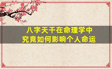 在命理学中,八字天干(甲、乙、丙、丁、戊、己、庚、辛、壬、癸)是分析个人命运的核心要素之一,与地支共同构成“四柱八字”。天干代表着能量的显性表达,其影响主要通过五行属性、生克关系、十神配置等体现。以下是具体解析: