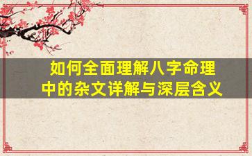 要全面理解八字命理中的“杂文详解”与深层含义,需结合传统命理学体系、文化背景及实践应用,从多个维度进行剖析。以下为系统化的解析框架: