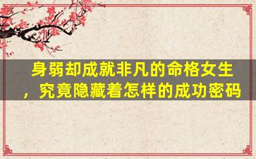 "身弱"在命理学中通常指出生日主五行能量偏弱,但这类女性往往能通过独特的生命策略实现非凡成就。她们的"成功密码"本质上是后天环境与个人特质的巧妙共振,暗合现代心理学"逆境成长"理论。以下从命理表象与深层逻辑两个维度解析: