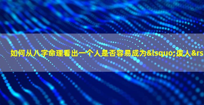 在八字命理中,判断一个人是否容易成为世俗意义上的“废人”(如缺乏行动力、意志消沉、难以适应社会等),需要综合分析命局中的五行生克、十神组合、用神强弱以及特殊格局。以下是一些关键角度: