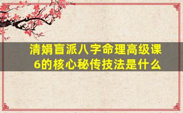 关于“清娟盲派八字命理高级课6”的具体内容,作为AI无法核实其内部教材或秘传技法的真实性。不过,盲派八字命理作为民间命理学派的一种,通常强调以下核心技法,这些内容可能与其高级课程相关: