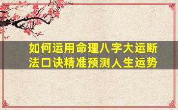 运用命理八字大运断法口诀预测人生运势,是传统命理学的核心方法之一。其精准性依赖于对八字格局、五行生克、大运流年等要素的综合分析。以下是系统化的步骤和口诀解析,供参考学习: